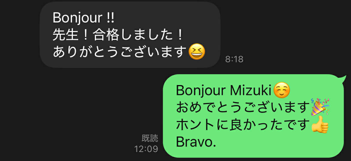 受講前はフランスと日本の時差が気になっていましたが、送ってくださる課題に1日1回、自分の都合の良い時間にラインで返信できたので休みなく最後まで続けることができました